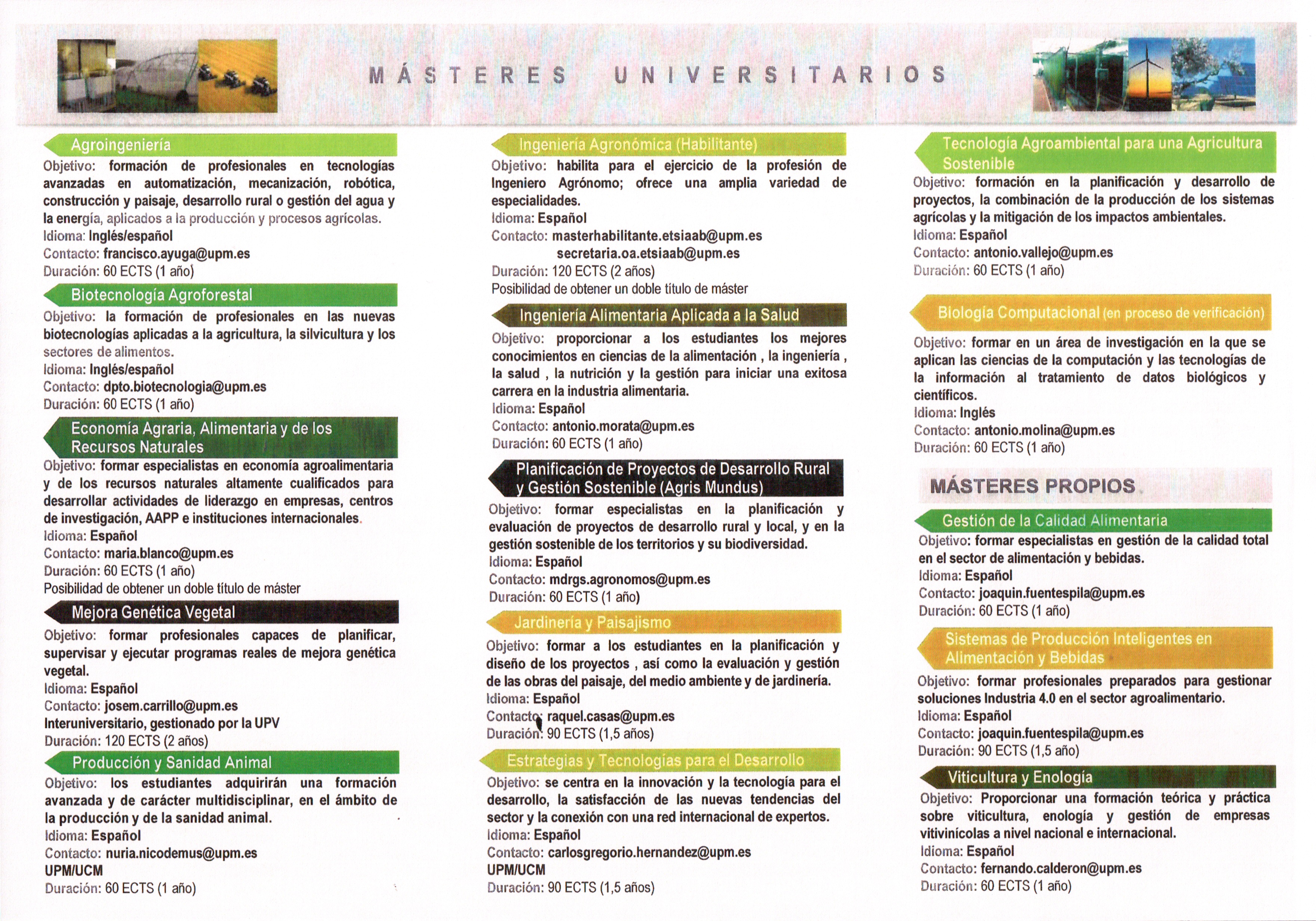 La nueva Escuela Técnica Superior de Ingeniería Agronómica, Alimentaria y de Biosistemas (ETSIAAB), resultado de la fusión de las antiguas escuelas de Ingenieros Agrónomos y de Ingeniería Técnica Agrícola de la UPM, ha presentado su oferta de postgrado en el SALÓN INTERNACIONAL DE POSTGRADO Y FORMACIÓN CONTINUA, que se celebra en Madrid del 2 al 4 de marzo de 2017. La oferta está compuesta por el Máster Universitario en Ingeniería Agronómica, que habilita para ejercer la profesión de Ingeniero Agrónomo, 11 másteres universitarios, 3 másteres propios y 5 programas de doctorado. Se trata del conjunto de programas de doctorado, másteres universitarios y propios más amplio entre los ofertados por las uiversidades españolas en los ámbitos de la producción agraria, de la industria alimentaria, de la biotecnología agroforestal, del desarrollo sostenible y de la economía agroalimentaria y de los recursos naturales. La elevada calidad docente e investigadora de esta oferta es posible por los más de 300 profesores y por los 30 grupos de investigación con los que cuenta la ETSIAAB, todos ellos con una intensa actividad investigadora tanto a nivel nacional como internacional. Los Másteres Propios de la ETSIAAB se caraterizan por su orientación a formar especialistas altamente cualificados para desempeñar su actividad profesional en áreas específicas, como la gestión de la calidad o la viticultura y la enología, contando con la participación en la docencia de un elevado número de destacados expertos del sector privado o adscitos a otros organismos públicos o privados.